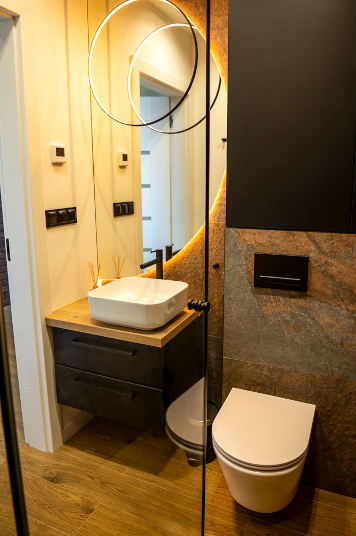 dwie łazienki oraz sauna i kominek